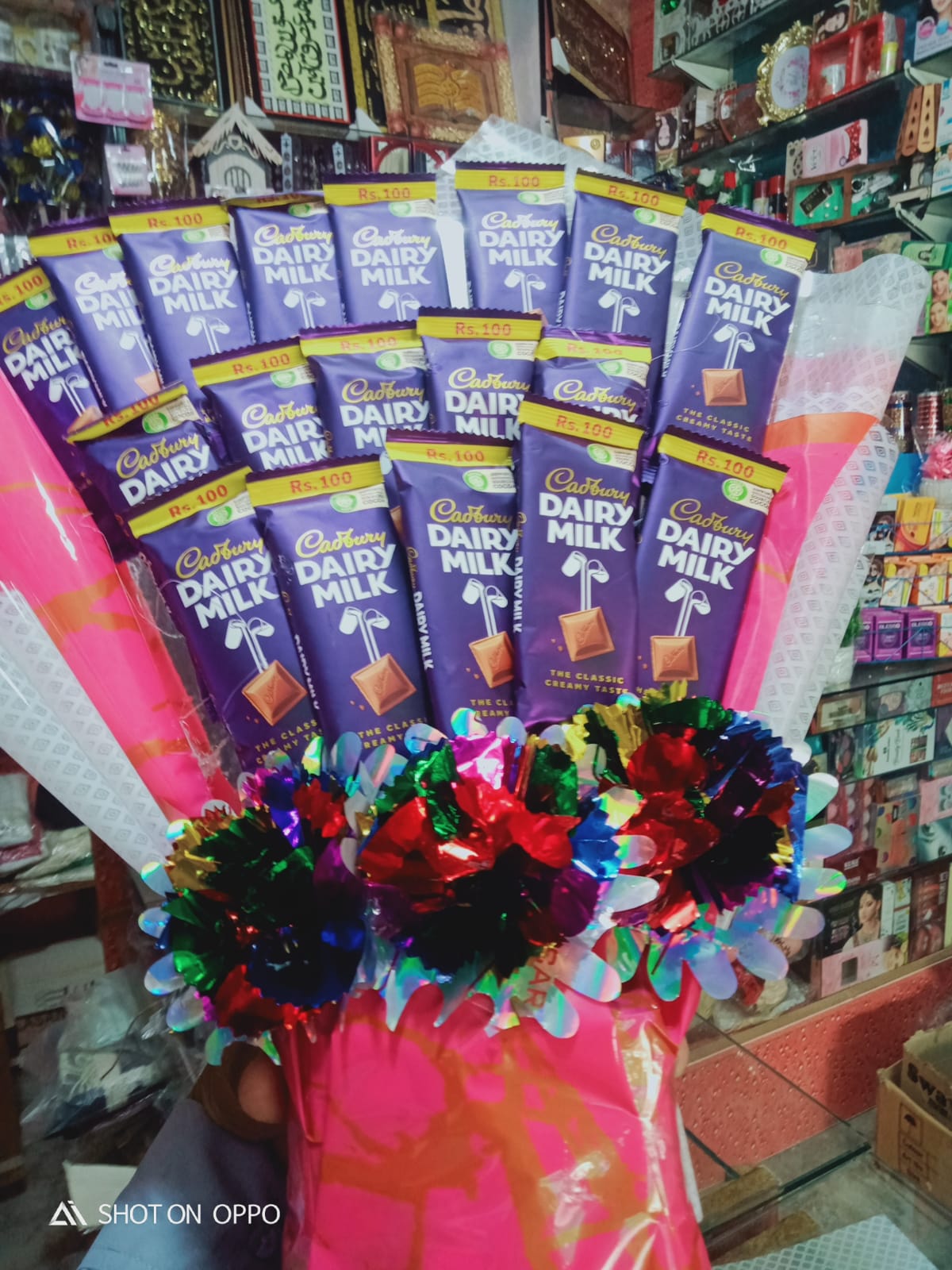 The chocolates are arranged in a circular bunch tied with pink wrapping paper and multicolored decorative ribbons at the base, placed on a glass counter with green artificial grass in front. The background displays shelves filled with various gift items, decorative frames, and cosmetics.
